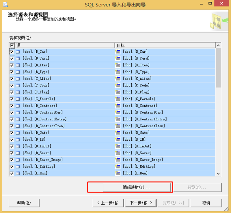 2、選擇表和源視圖--編輯映射--刪除現有目標表中的行、啟用標識插入--打上對勾--確定。