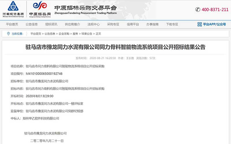 恭賀我司中標(biāo)駐馬店同力骨料有限公司智能物流系統(tǒng)項(xiàng)目。