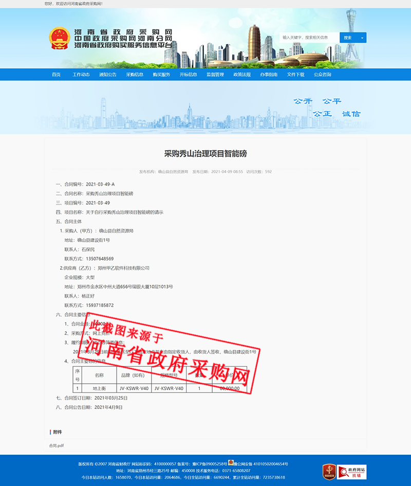 恭賀鄭州甲乙科技中標確山縣自然資源局秀山治理項目智能磅系統。